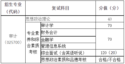 (一)复试总成绩满分为300分,复试科目由“思想政治理论”和“专业素养和综合素质考核”组成。“专业素养和综合素质考核”分为审计学、专业方向考核(财务会计、金融学或管理信息系统)、综合面试(含英语听说)和思想政治素质和品德考核四部分。其具体内容和分值为: