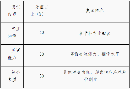 复试由各培养单位组织开展。复试主要是考核考生综合运用专业知识分析和解决问题的能力、评判思维能力、举止和语言表达能力、人文素养、心理素质等,实行百分制计分,包括专业知识、英语能力、综合素质。复试成绩低于60分不予录取。具体各项赋值及复试内容见下表。