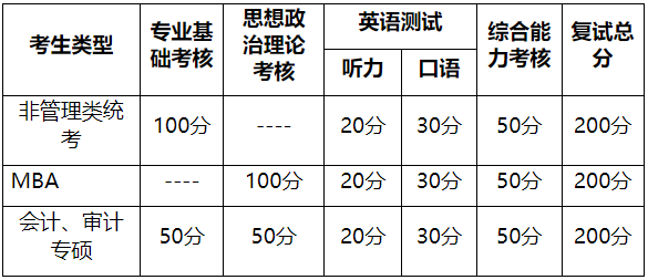 审计、会计专业:复试成绩=思想政理论考核+专业基础考核+外语听力+外语口语+综合能力考核。复试成绩总分200分。