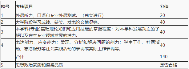 专业综合面试在对考生德智体等各方面全面考察基础上,突出对专业素质、实践能力以及创新精神等方面的考核。考核项目及分值如下表: