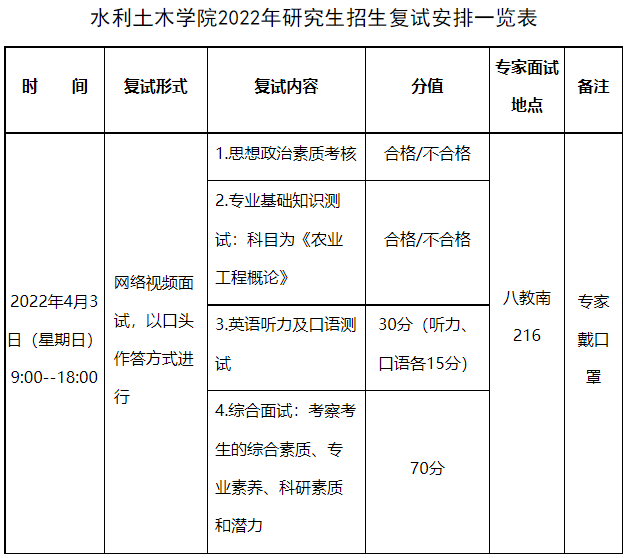 复试时间,内容、分值及地点等见《水利土木学院2022年研究生招生复试安排一览表》