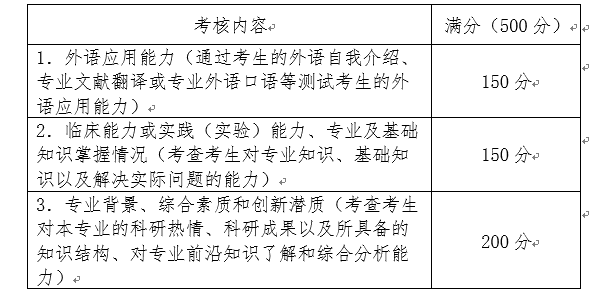 2.按专业组织面试,考察内容包括思想政治素质和品德、临床能力或实践(实验)能力、专业知识、英语能力、综合素质和创新潜质等等。考核方式和程序由考核小组自行确定。