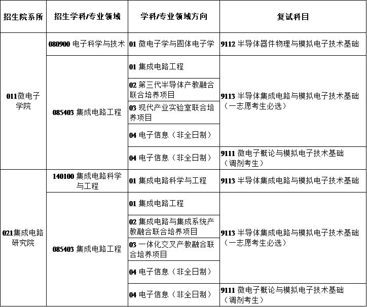 面向一志愿报考微电子学院/集成电路研究院学科代码为08开头的各学科专业,初试成绩满足“085403集成电路工程”04方向复试分数要求的考生开放(一志愿考生未被录取的均可申请),本批次考生按调剂专业方向复试科目准备复试。根据第一批次调剂考生录取后的缺额情况,择优录取,录满即止。