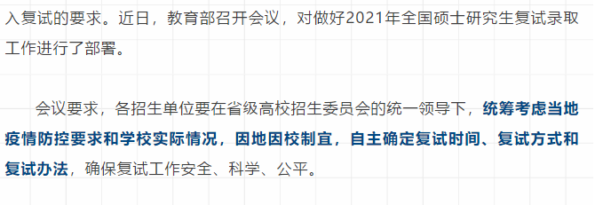 从教育部会议来看,并未明确复试形式,以各地实际为准,因此考生要积极关注各校复试通知做好线上面试和线下面试的准备。