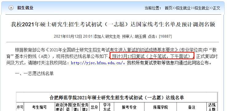 复试具体时间一定要看清楚:例如,合肥师范学院,3月17日(4天后)开始复试,上午笔试,下午面试,复试的相关材料或者设备需提前准备和测试。