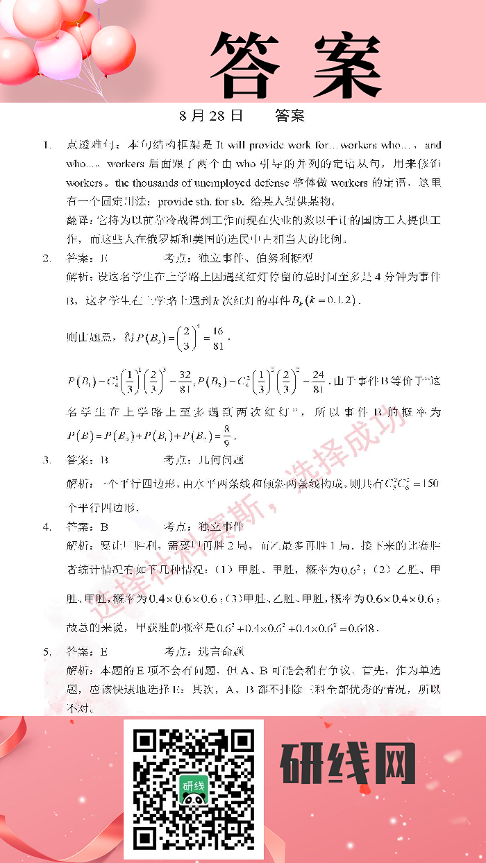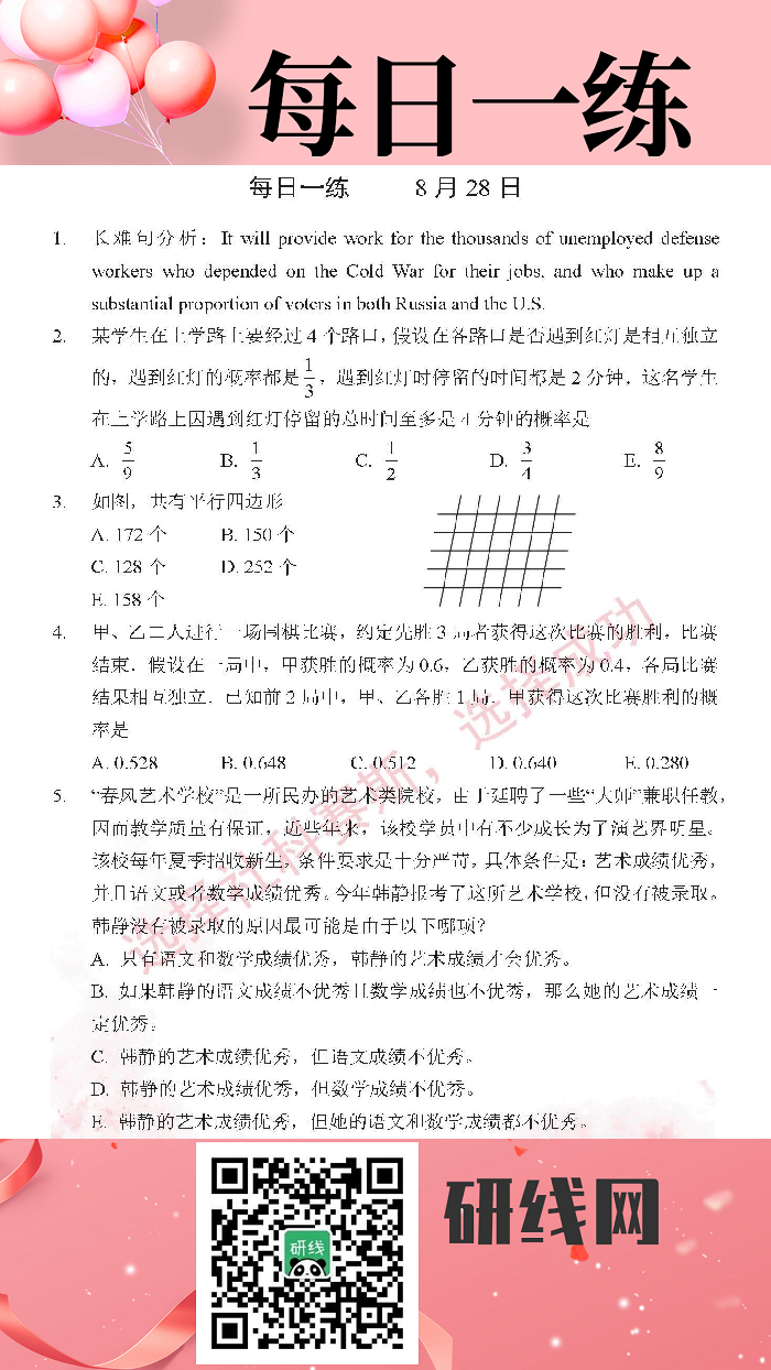为了更好的复习和巩固已经学过的知识,研线网小编为大家整理出几道题,作为每日的练习,希望能够帮助到同学们哦!