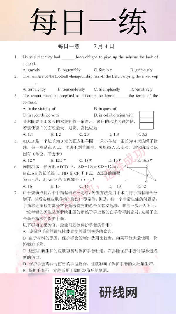 以上就是今日每日一练的全部内容,跟着每日一练,拼搏在线官网轻松复习!更多考试练习,点击管理类联考每日一练!