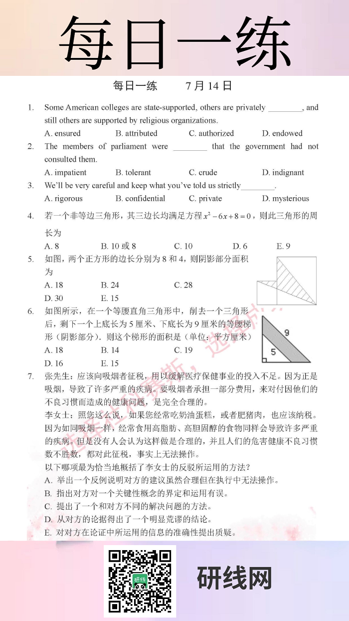 为了更好的复习和巩固已经学过的知识,研线网小编为大家整理出几道题,作为每日的练习,希望能够帮助到同学们哦!