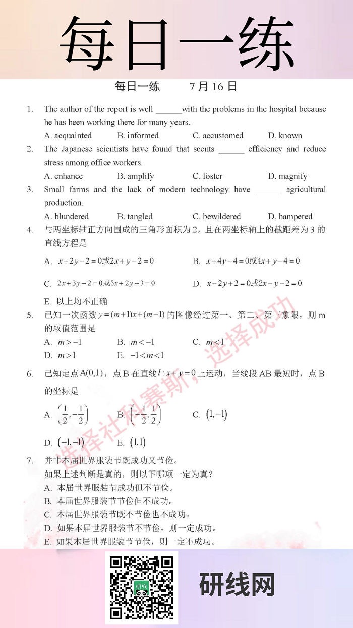 为了更好的复习和巩固已经学过的知识,研线网小编为大家整理出几道题,作为每日的练习,希望能够帮助到同学们哦!