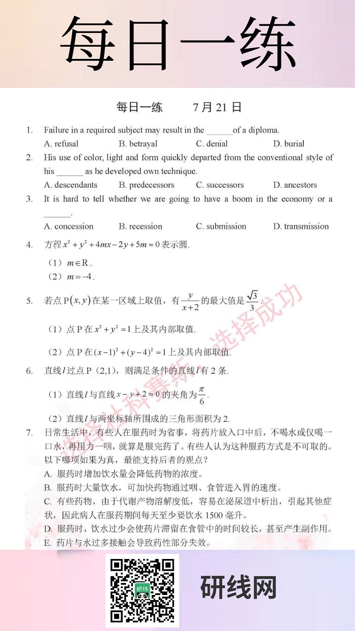 为了更好的复习和巩固已经学过的知识,研线网小编为大家整理出几道题,作为每日的练习,希望能够帮助到同学们哦!