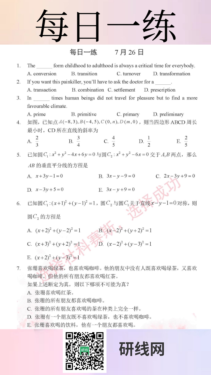 为了更好的复习和巩固已经学过的知识,研线网小编为大家整理出几道题,作为每日的练习,希望能够帮助到同学们哦!