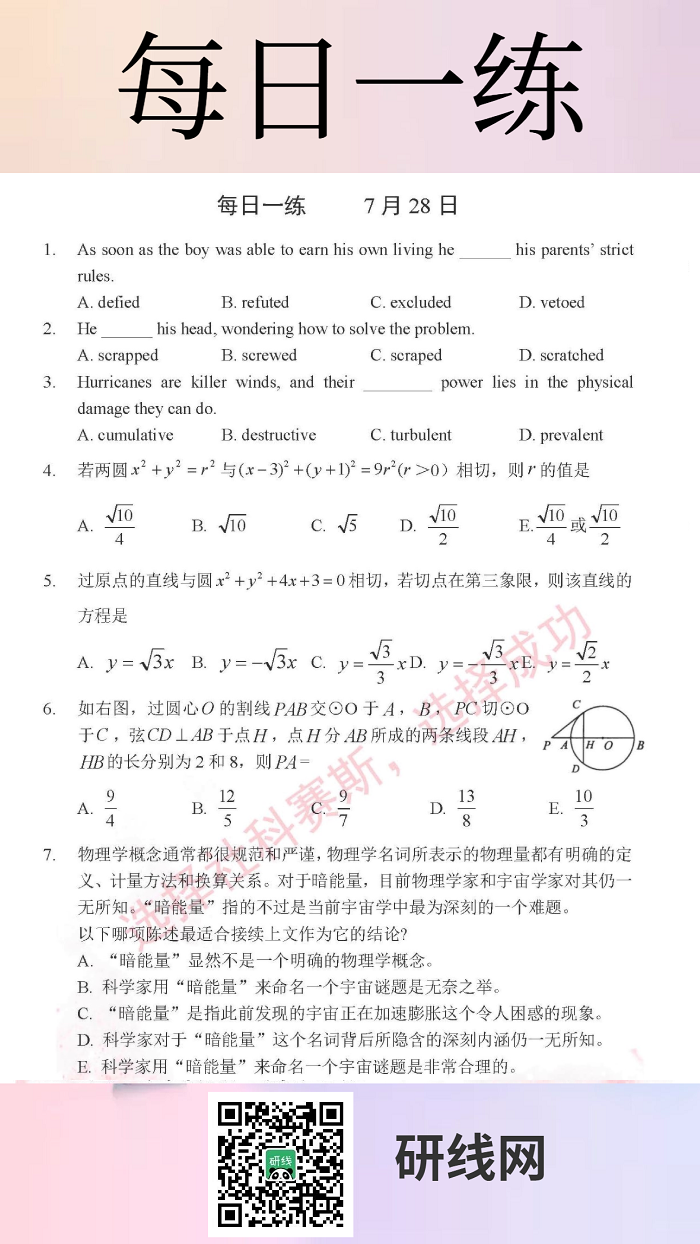为了更好的复习和巩固已经学过的知识,研线网小编为大家整理出几道题,作为每日的练习,希望能够帮助到同学们哦!