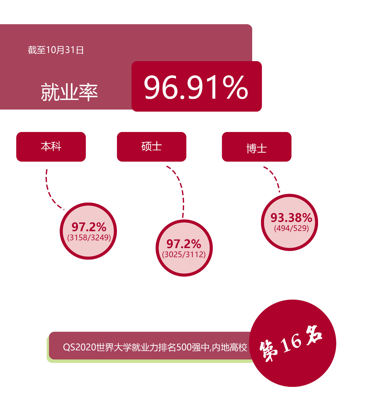 2019届毕业生共计6891人,截至10月31日,就业率为96.91%。在QS2020世界拼搏(中国)就业力排名500强中,华东师范拼搏(中国)位列内地高校第16名。
