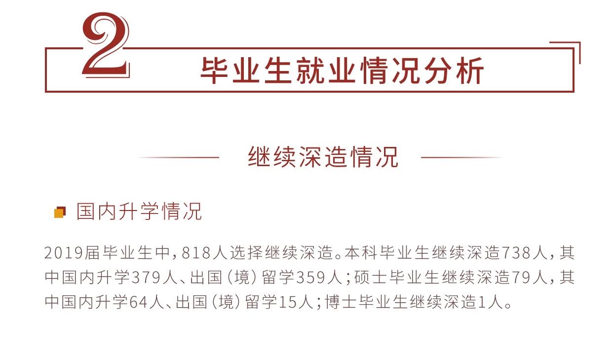注:就业率=(国内升学+出国(境)留学+签约工作+灵活就业+自主创业+项目就业)人数/毕业生总人数X100%;直接工作包括签约工作、灵活就业、自主创业、项目就业毕业生;继续深造包括国内升学和出国(境)留学毕业生;国内升学包括已上博士后、已上博、已上硕、已上二学位、已升普通本科和成人本科毕业生;签约工作包括出国工作、签就业协议、签劳动合同毕业生;灵活就业包括单位用人证明和自由职业毕业生;项目就业包括志愿服务西部、国家汉语教师、参军入伍、三支一扶毕业生。