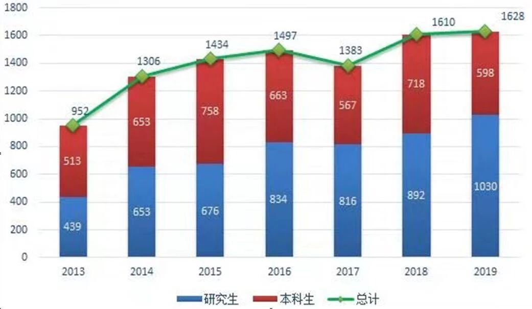 近年来,我校应届毕业生入职世界五百强人数呈上升趋势,其中2019届毕业生达1628人,其中研究生1030人、本科生598人。