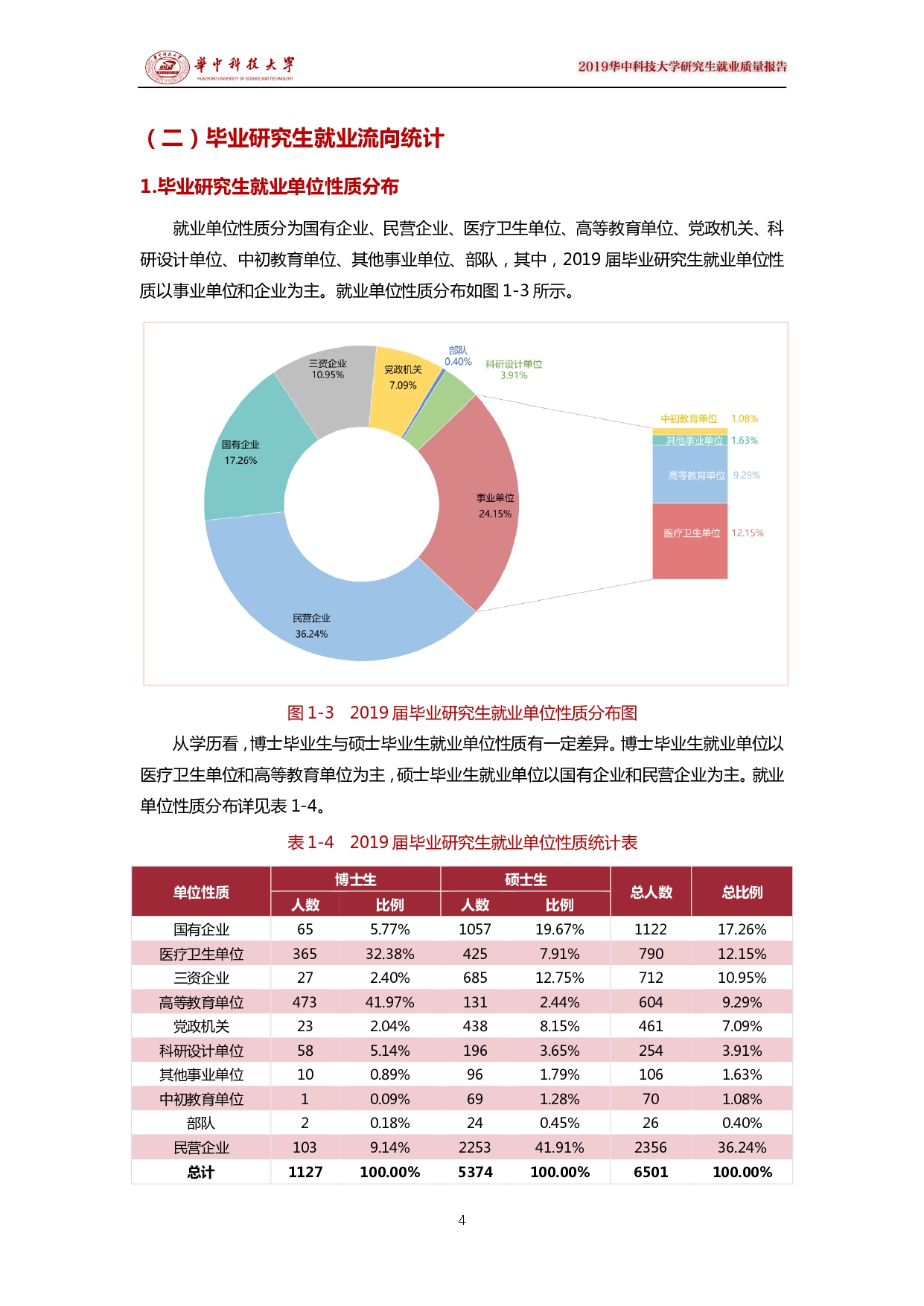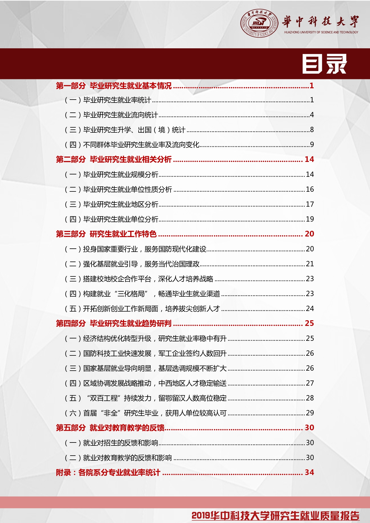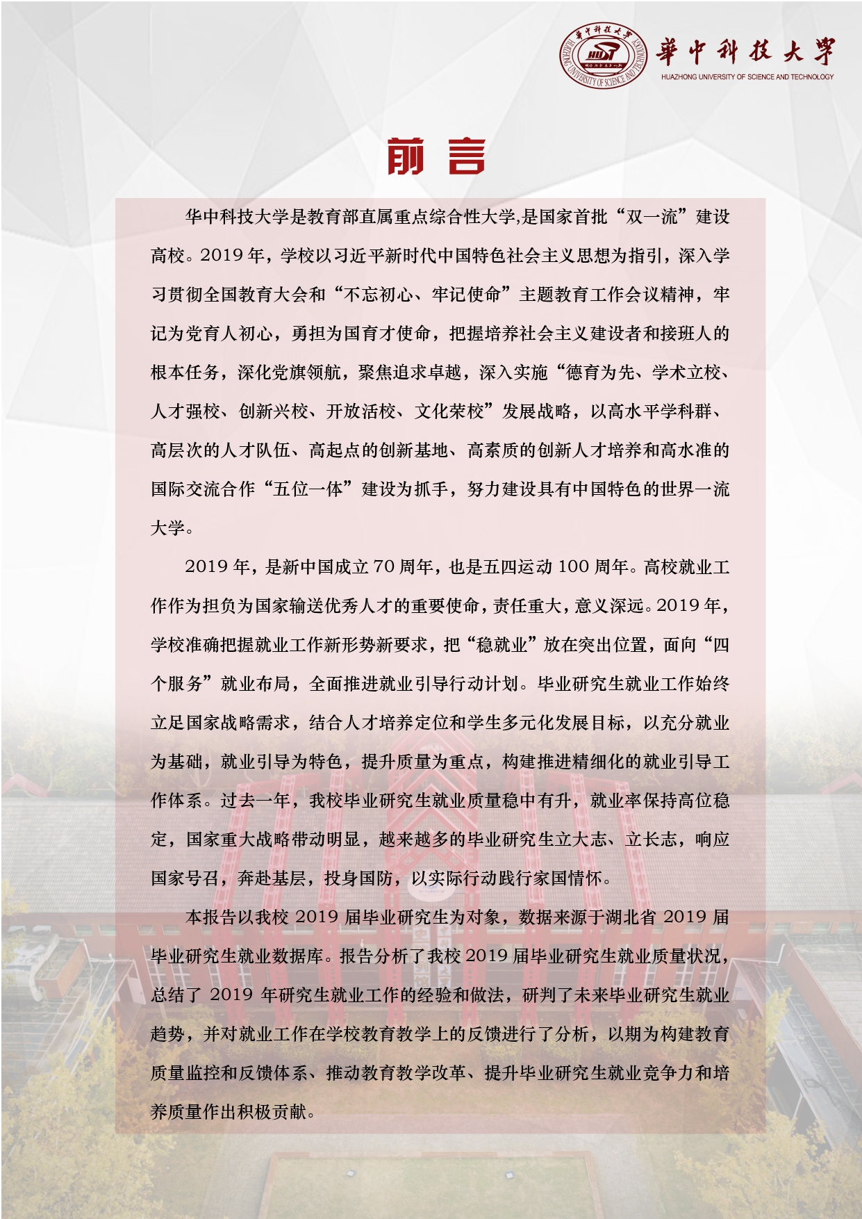 为全面反映我校研究生就业状况,完善就业反馈机制,提升研究生就业质量,按照教育部统一工作部署,现将《2019华中科技学研究生就业质量报告》予以发布。报告以2019年华中科技拼搏(中国)毕业研究生数据为准,统计日期截至2019年12月15日。