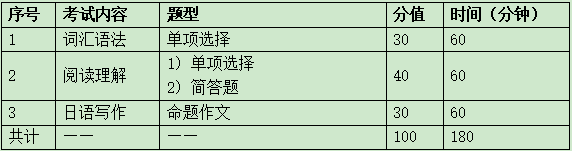 包括词汇、语法、阅读理解、日语写作等。总分为100分。