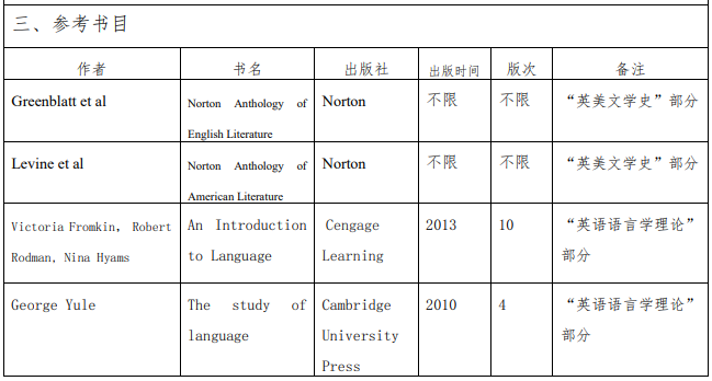 “英美文学史”部分的考试将采用主观题与客观题相结合的方式,包括填空(或选择) 、简答和详答题三部分。试题总分为 150 分,大致均摊于各部分。“英语语言学理论”部分的试题满分为 150 分,主要为简答题,共 4-6 题,每题 25-40 分。如果试卷结构有所变化,不再另行通知。