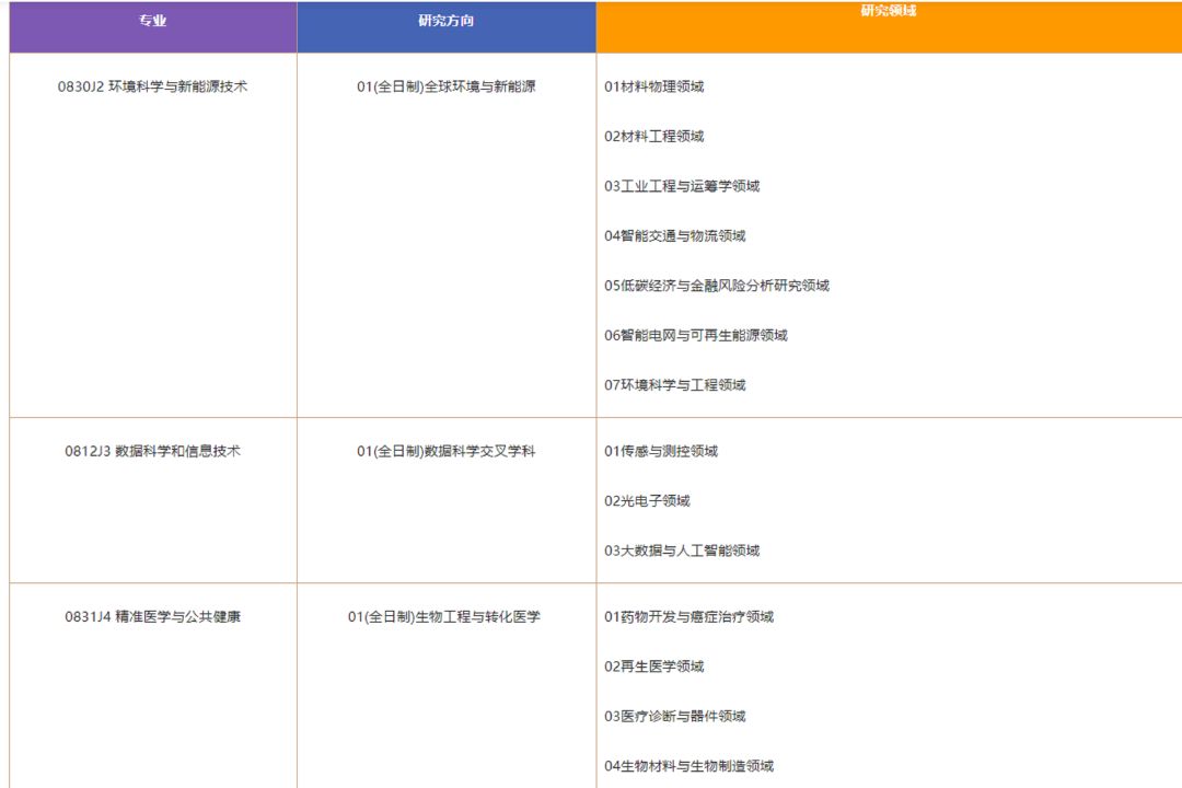 学院初期围绕“环境科学与新能源技术”、“数据科学和信息技术”、“精准医学与公共健康”建立跨学科研究中心,进行博士研究生及硕士研究生招生培养,未来将根据发展需要,拓展建立其他跨学科研究方向。