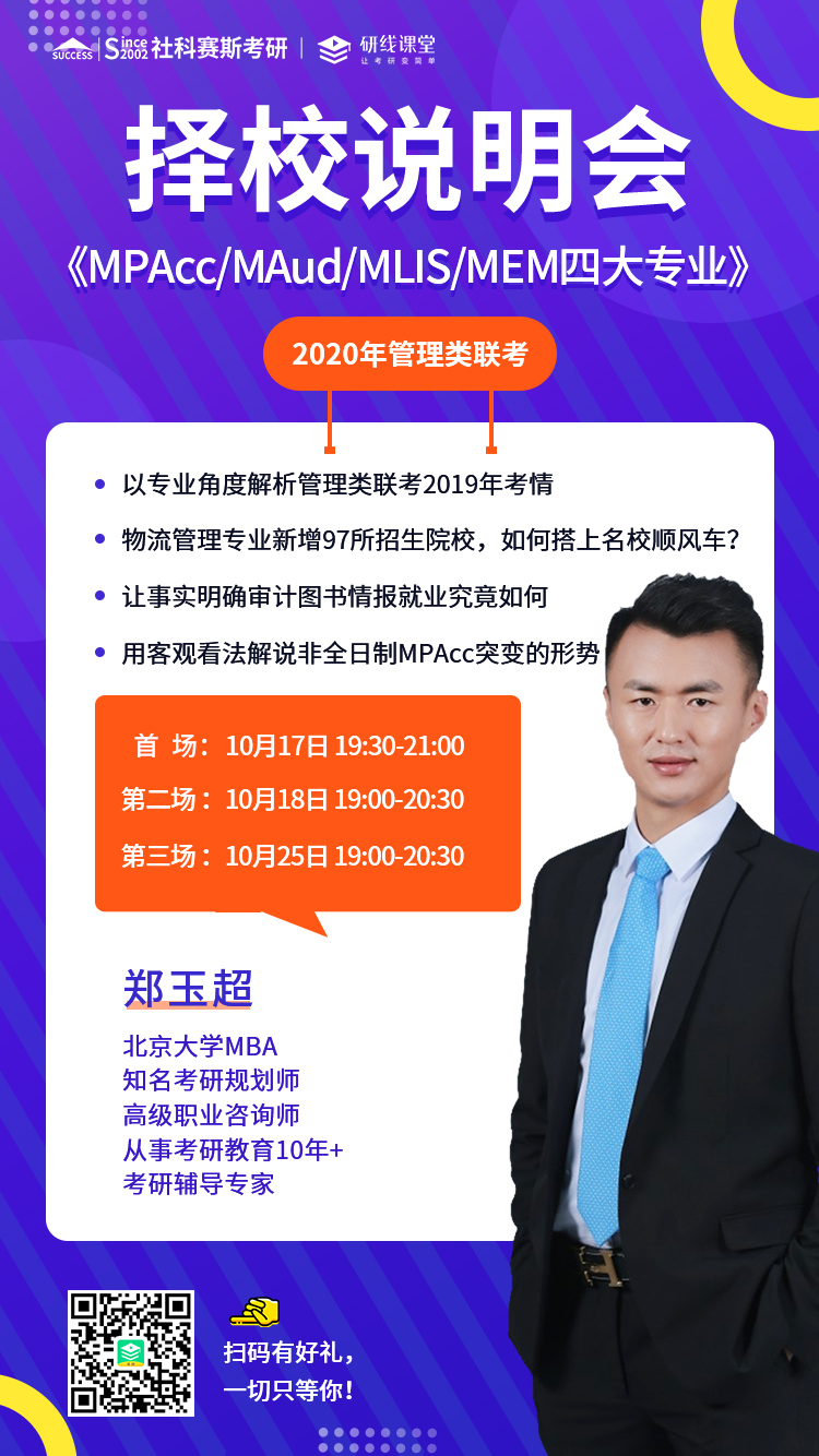 首先直播内容以目前已经公布2020年MPAcc/MAud/MLIS/MEM(物流工程与管理)院校的招生情况,新政解读,985/211院校招生政策为主进行。