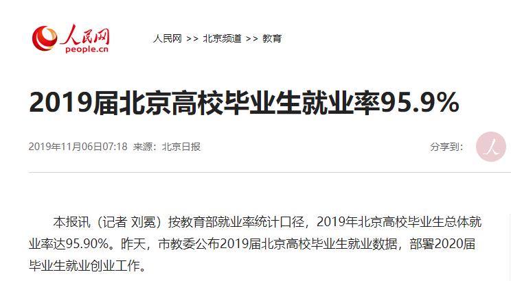 本报讯(记者 刘冕)按教育部就业率统计口径,2019年北京高校毕业生总体就业率达95.90%。昨天,市教委公布2019届北京高校毕业生就业数据,部署2020届毕业生就业创业工作。