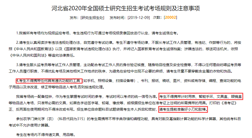 河北省明确规定禁止携带手表,要提前备小刀和胶棒。