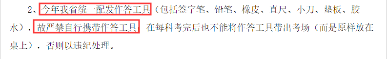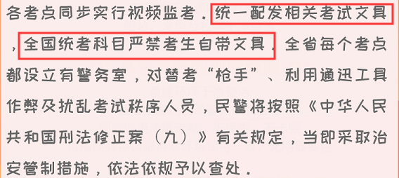 内蒙古自治区规定禁止携带中性笔、直尺、橡皮、文具袋,考试点会统一发放。