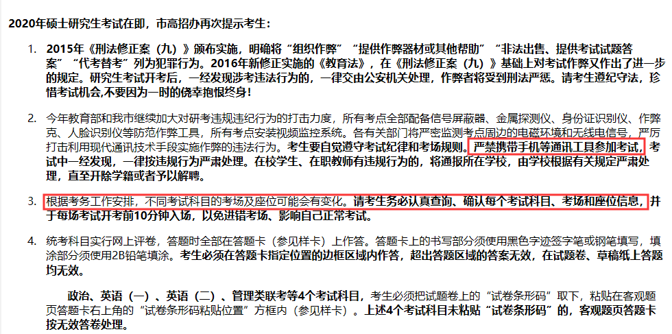 天津市各考点严禁携带手机等通讯工具,不同考试科目的考场及座位可能会有变更,考生务必准确查看。