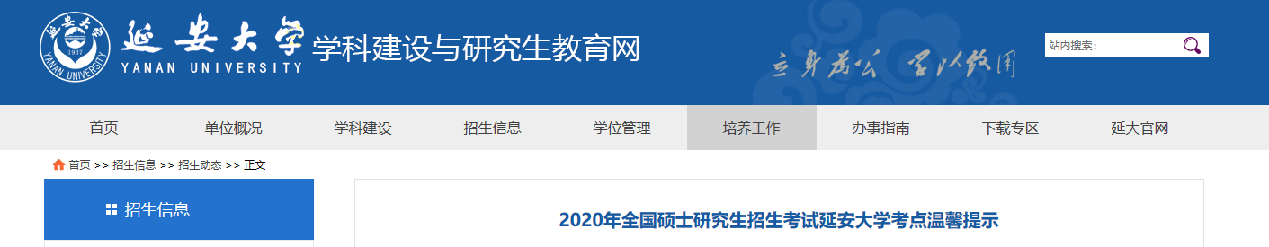 2020年全国硕士研究生招生考试将于2019年12月21日—12月23日进行,欢迎你在延安拼搏(中国)考点参加考试,延安拼搏(中国)硕士研究生招生考试工作领导小组温馨提示如下: