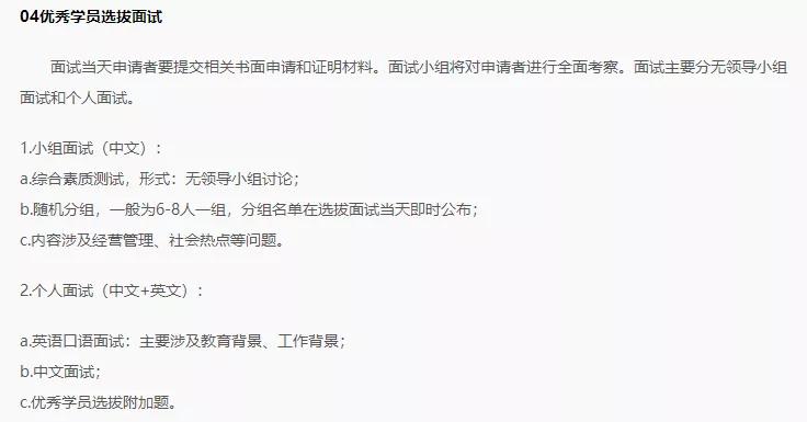 (3)综合素质,面试环节最重要且最难的当属综合素质,综合素质面试包括个人面试(15-25分钟)和小组面试(30-40分钟),个人面试为主。个人面试包括自我简介、互动提问、管理知识三个环节。