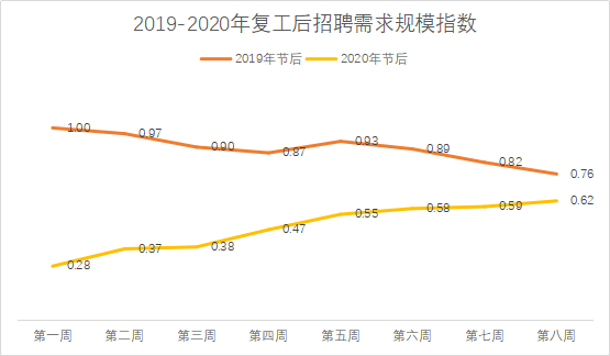 注:需求规模指数=指以2019年复工第一周招聘职位数为基数,反映企业招聘需求逐周变化的指数。