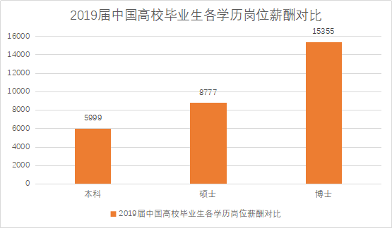 以2019年各学历层次的岗位薪酬为例,本科生的平均岗位薪酬为5999元,硕士生的岗位薪酬为8777元,博士生的岗位薪酬平均为15355元。硕士学历层次和本科学历层次之间的平均岗位薪酬差距为2778元,接近本科生平均岗位薪酬的一半,而博士和硕士之间的平均岗位薪酬差更高达6721元。每当学历层次上升一台阶都将带来薪酬水平的一大跨越。