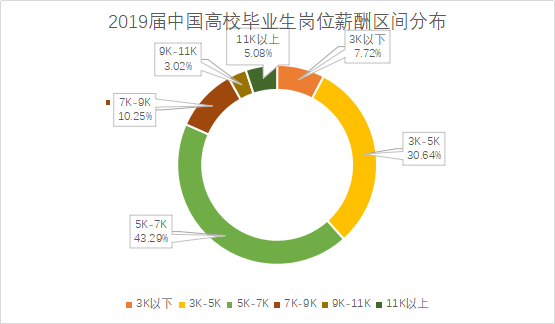 此外,根据梧桐果相关数据显示,2019届中国高校毕业生岗位薪酬区间的主流分布区间为5000—7000元,占比43.29%;而3000-5000元区间和3000元以下区间的占比分别为30.64%和7.72%,近四成应届毕业生的岗位薪酬还未达到5000元;7000元以上区间的占比为18.35%,其中11000元以上的占比仅为5.08%,高薪者极少。