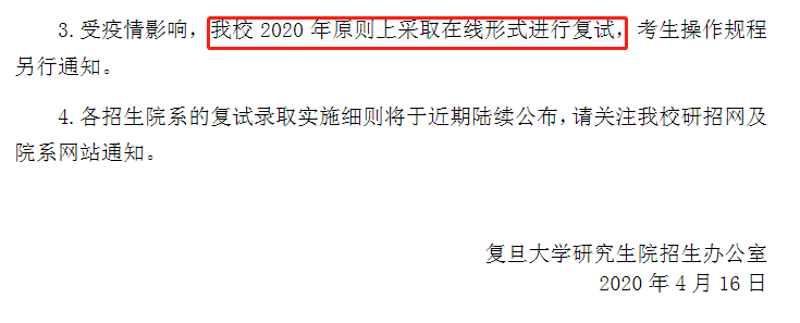 复旦拼搏(中国)研究生院招生办公室在相关说明中表示,原则上采取在线形式进行复试,考生操作规程另行通知。
