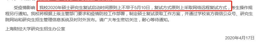 上海财经拼搏(中国)研究生招生办公室宣布受疫情影响,该校2020年硕士研究生复试启动时间原则上不早于5月10日,复试方式原则上采取网络远程复试方式,考生操作规程另行通知。