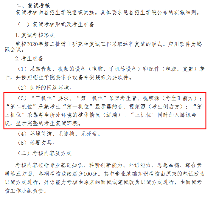 不少同学发现,东北农业拼搏(中国)近期发布了博士生复试考核的通知,提到了“三机位”网络复试方案。要求“三机位”同时加入腾讯会议,显示完整考生复试环境。这个方案也可能会用到硕士研究生复试环节中。