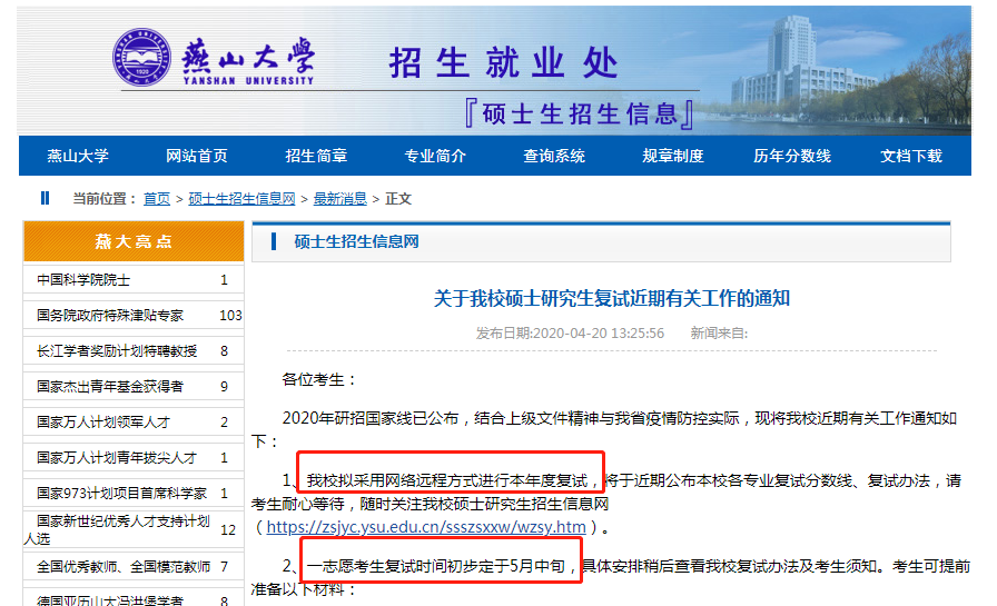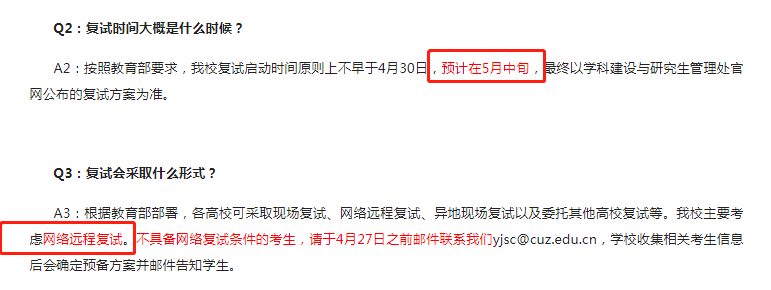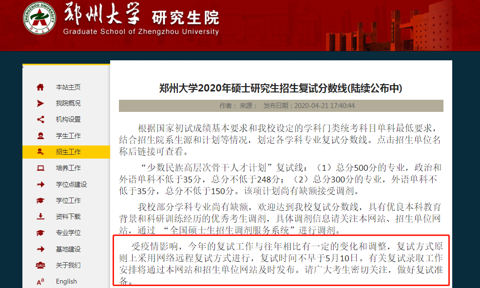受疫情影响,今年的复试工作与往年相比有一定的变化和调整,复试方式原则上采用网络远程复试方式进行,复试时间不早于5月10日。有关复试录取工作安排将通过本网站和招生单位网站及时发布。