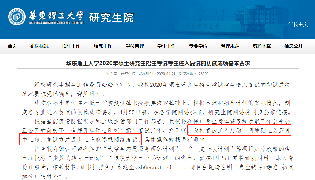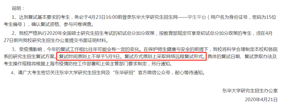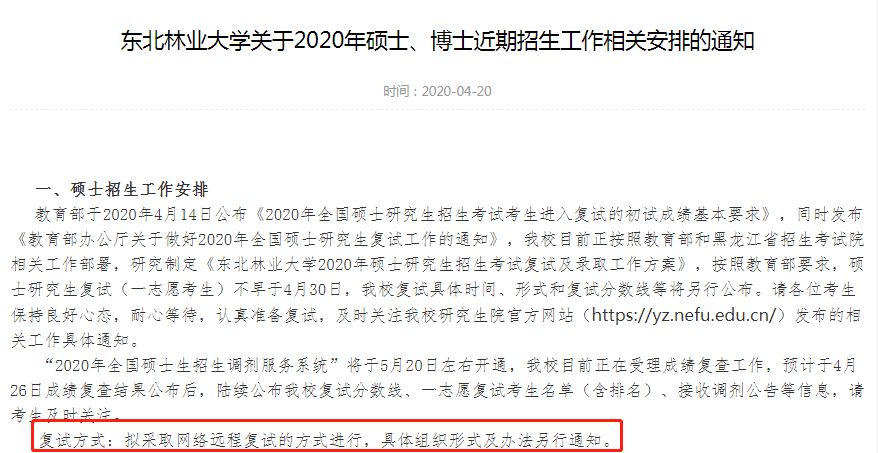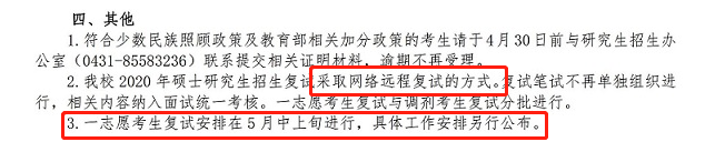 经研究,该校复试工作启动时间原则上为五月中上旬,复试方式原则上采取远程网络复试,具体操作规程另行通知。