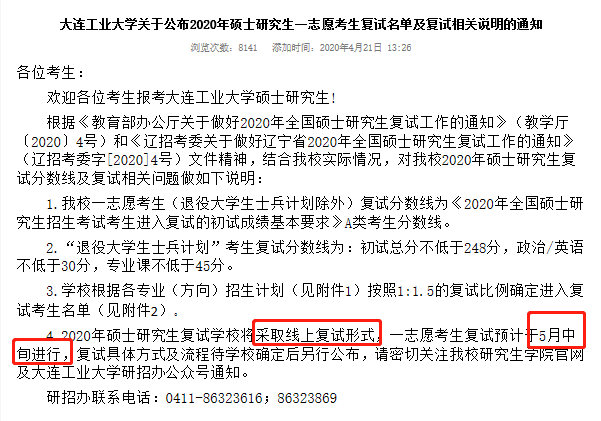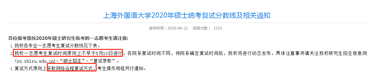 该校一志愿考生复试时间原则上不早于5月10日进行,复试方式原则上采取网络远程复试方式,考生操作规程另行通知。