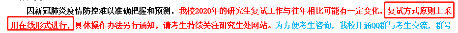 因新冠肺炎疫情防控难以准确把握和预测,该校2020年的研究生复试工作与往年相比可能有一定变化,复试方式原则上采用在线形式进行,具体操作办法另行通知,请考生持续关注研究生处网站。