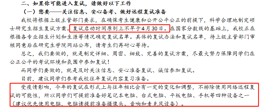 受疫情影响,今年的复试在形式上与往年相比会有一定的变化和调整,不排除使用网络远程复试的可能性,所以同学们可提前准备好笔记本电脑、台式电脑、平板电脑、手机等四种设备之一(建议优先使用电脑,电脑请提前准备摄像头、音响和麦克风设备)。