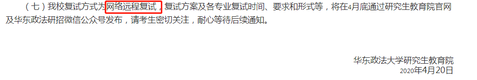 该校复试方式为网络远程复试,复试方案及各专业复试时间、要求和形式等,将在4月底通过研究生教育院官网及华东政法研招微信公众号发布,请考生密切关注,耐心等待后续通知。