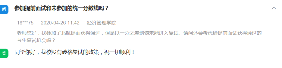 问:老师您好,我参加了北航提面获得通过,但是以一分之差遗憾未能进入复试。请问还会考虑给提前面试获得通过的考生复试机会吗?