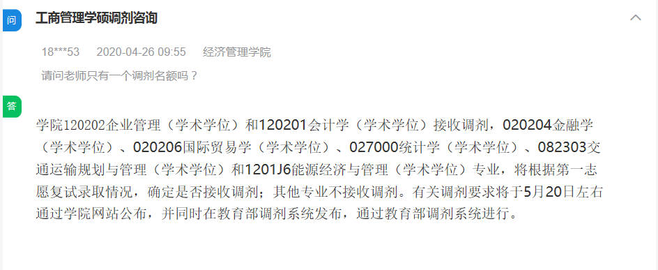 回答:学院120202企业管理(学术学位)和120201会计学(学术学位)接收调剂,020204金融学(学术学位)、020206国际贸易学(学术学位)、027000统计学(学术学位)、082303交通运输规划与管理(学术学位)和1201J6能源经济与管理(学术学位)专业,将根据第一志愿复试录取情况,确定是否接收调剂;其他专业不接收调剂。有关调剂要求将于5月20日左右通过学院网站公布,并同时在教育部调剂系统发布,通过教育部调剂系统进行。