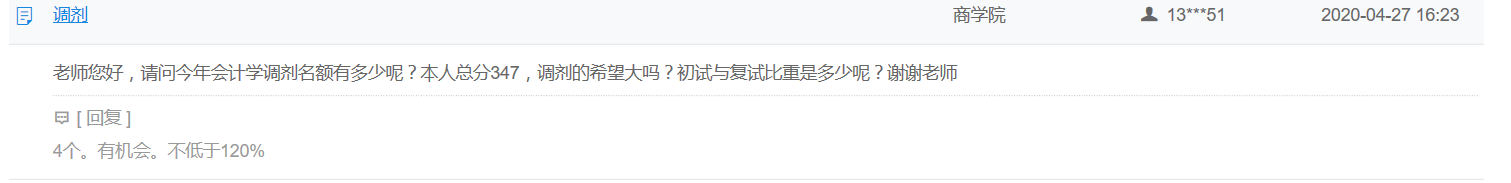 问:老师您好,请问今年会计学调剂名额有多少呢?本人总分347,调剂的希望大吗?初试与复试比重是多少呢?谢谢老师
