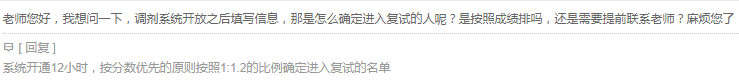 答:系统开通12小时,按分数优先的原则按照1:1.2的比例确定进入复试的名单