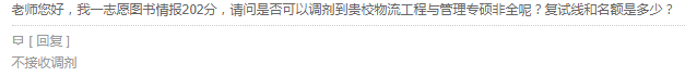 问:老师您好,我一志愿图书情报202分,请问是否可以调剂到贵校物流工程与管理专硕非全呢?复试线和名额是多少?