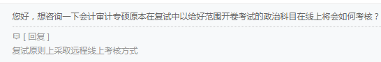 问:您好,想咨询一下会计审计专硕原本在复试中以给好范围开卷考试的政治科目在线上将会如何考核?