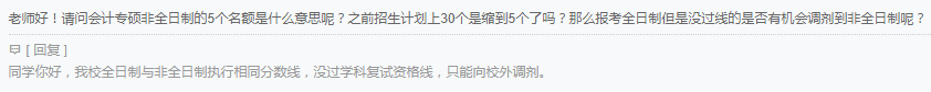 问:老师好!请问会计专硕非全日制的5个名额是什么意思呢?之前招生计划上30个是缩到5个了吗?那么报考全日制但是没过线的是否有机会调剂到非全日制呢?