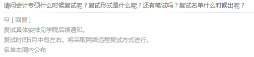 问:请问会计专硕什么时候复试呢?复试形式是什么呢?还有笔试吗?复试名单什么时候出呢?